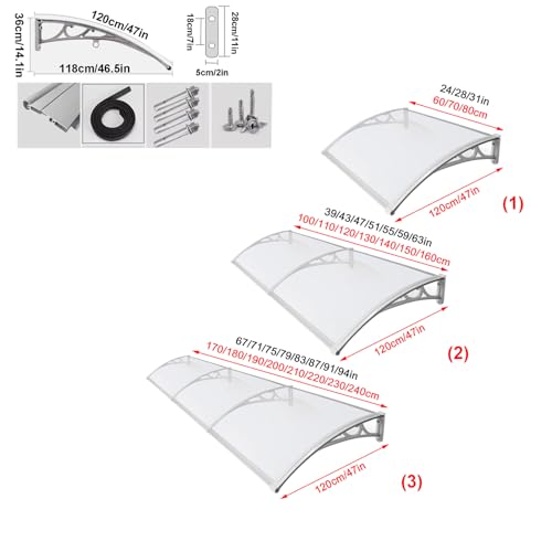 Aluminium buitenluifel voor deur en raam (120 x 240 cm) biedt duurzame bescherming tegen alle weersomstandigheden. De weerbestendige polycarbonaat luifel, ondersteund door een witte draagstructuur, is geluiddicht en perfect voor thuisgebruik. Het oppervlak met UV-coating reflecteert 99% van de schadelijke UV-stralen, beschermt je meubels en elektronica tegen oververhitting en helpt huidbeschadiging door direct zonlicht te voorkomen. Eenvoudig te installeren en te combineren voor een grotere dekking.