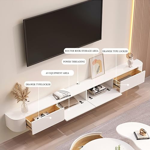 De zwevende tv-kast is vervaardigd uit hoogwaardig massief houtcomposiet, wat zorgt voor een stevige en duurzame constructie die bestand is tegen slijtage en kleurvervaging. De meegeleverde wandmontageaccessoires en hardware garanderen een veilige en stabiele bevestiging. Het moderne en praktische ontwerp met kabelgaten en een middenvak voor stopcontacten draagt bij aan een opgeruimde en georganiseerde uitstraling.